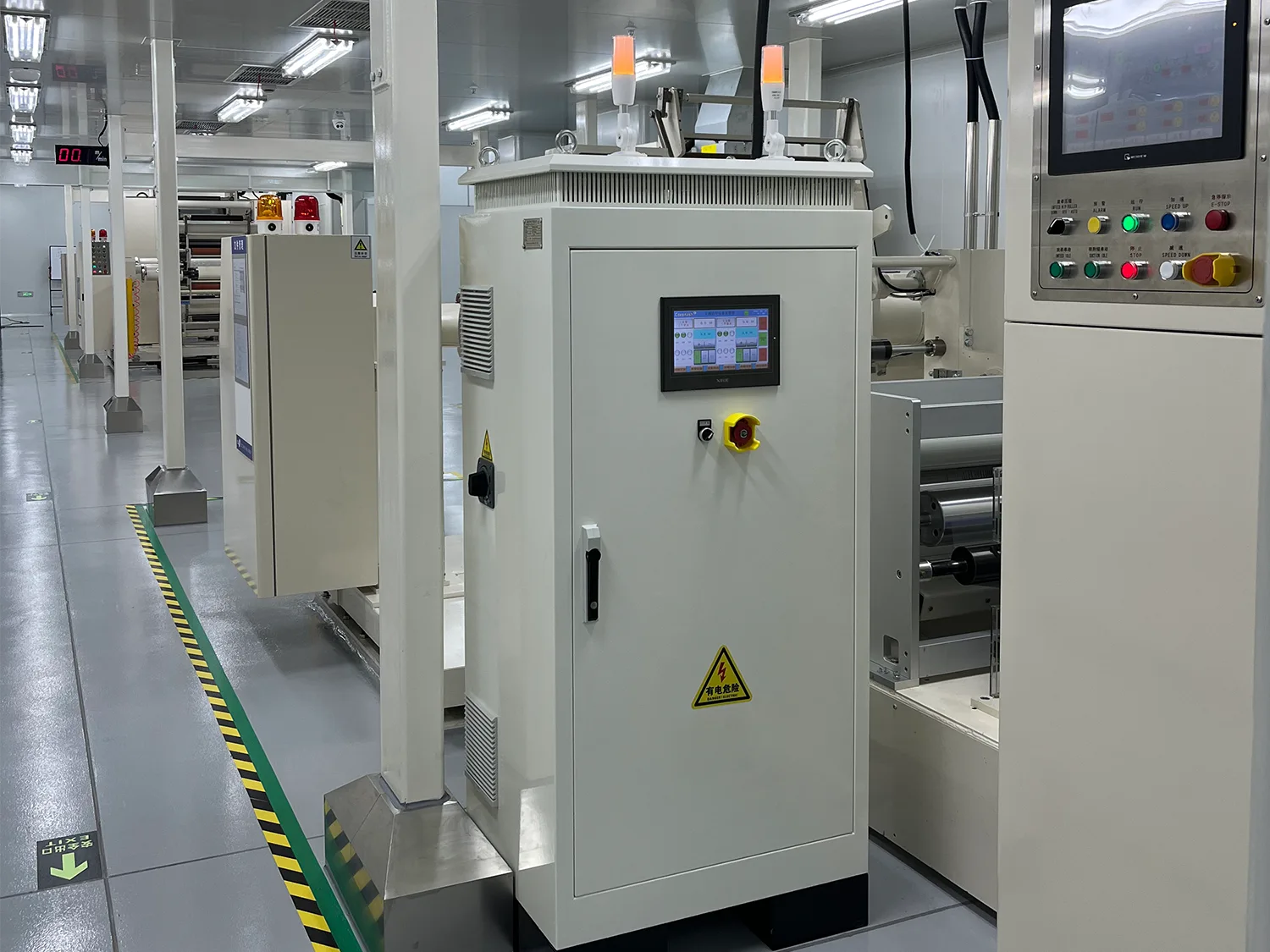 Thin film corona treatment machine uses high-frequency and high-voltage pulses to ionize the air between the discharge electrodes, forming corona and streamer discharge. Ozone is generated during discharge due to air ionization, which can effectively remove oil stains on the surface of the film; Simultaneously stimulating the generation of polar functional groups on the surface of the thin film. Thus enhancing the penetration and adhesion of ink and adhesive on plastic film.